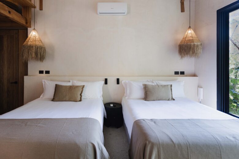 Spacious and family-friendly, this bungalow features two double beds plus a loft (tapanco) with two additional double beds, ideal for groups. Equipped with dual air conditioning for extra comfort. The bathroom includes separate W/C and shower areas, giving everyone space and privacy. Perfect for traveling together without stepping on each other’s vibe. The suite features a premium mattress dressed with high-quality 400-thread-count sheets, ensuring an exceptional night’s sleep.